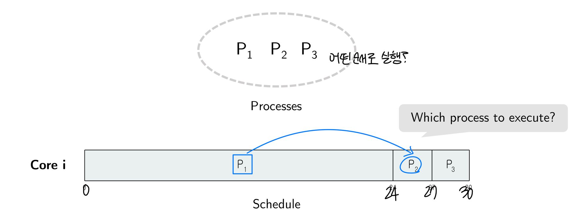 - ์ด๋ค CPU ์ฝ์ด์ ์ด๋ค ํ๋ก์ธ์ค๋ฅผ ์คํ์ํฌ์ง ๊ฒฐ์ ํด์ค๋ค.