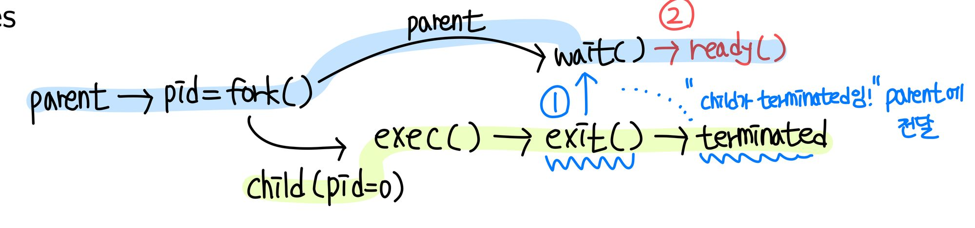 - child๊ฐ exit๋๋ฉด terminated ์ํ๊ฐ ๋๊ณ , ์ด๊ฒ์ด system call๋ก parent๋ก ์ ๋ฌ๋๋ฉด, wait์ด์๋ parent๋ ๋ค์ ready ์ํ๊ฐ ๋๋ค.