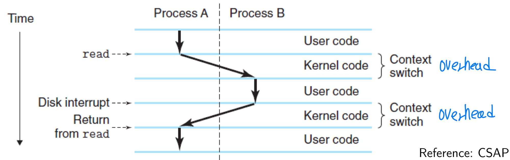 - ์ปจํ ์คํธ ์ค์์น ๊ฐ์ด hw support์ ๋ฐ๋ผ ๋ค๋ฅด๋ค.→ ๋ถ๋ฌ์๋ค๊ฐ ๋ค์ ์ ์ฅํ ํ์ ์์ด, ํ๋ก์ธ์ค ์์์ ์๋ค๊ฐ๋ค