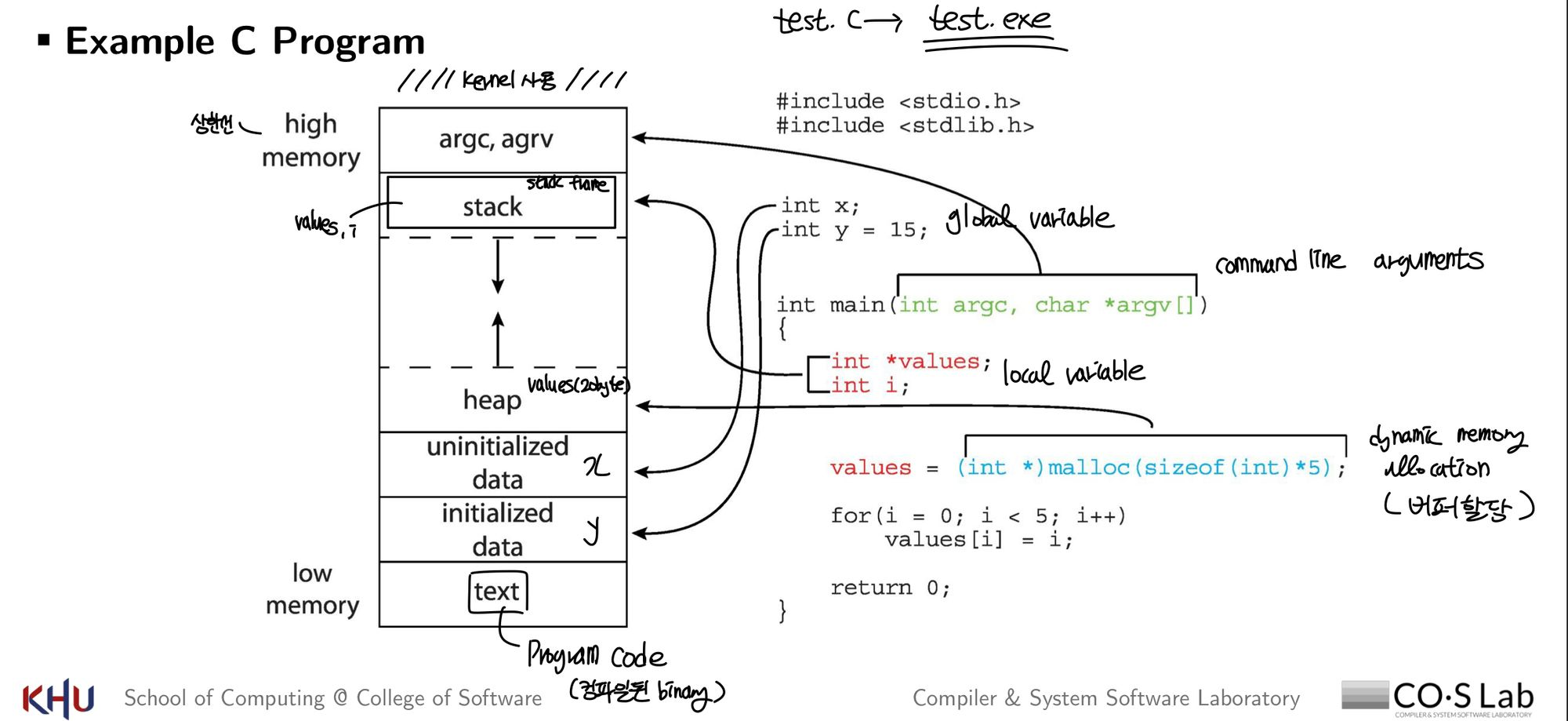 - high memory : command line argument๋ค์ด argc, argv์ ์ ์ฅ๋๋ค.