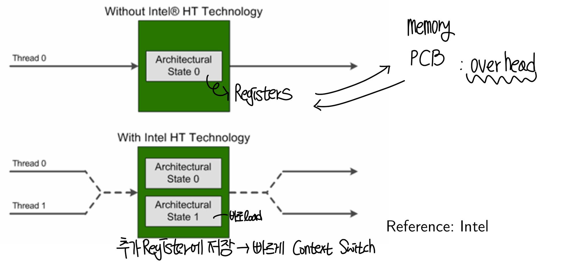 - → ํ CPU์ ์ฌ๋ฌ๊ฐ์ Register๋ฅผ ์ ๊ณต = ์ฌ๋ฌ๊ฐ Context๋ฅผ ํ๋ฒ์ ๋ก๋ ๊ฐ๋ฅ