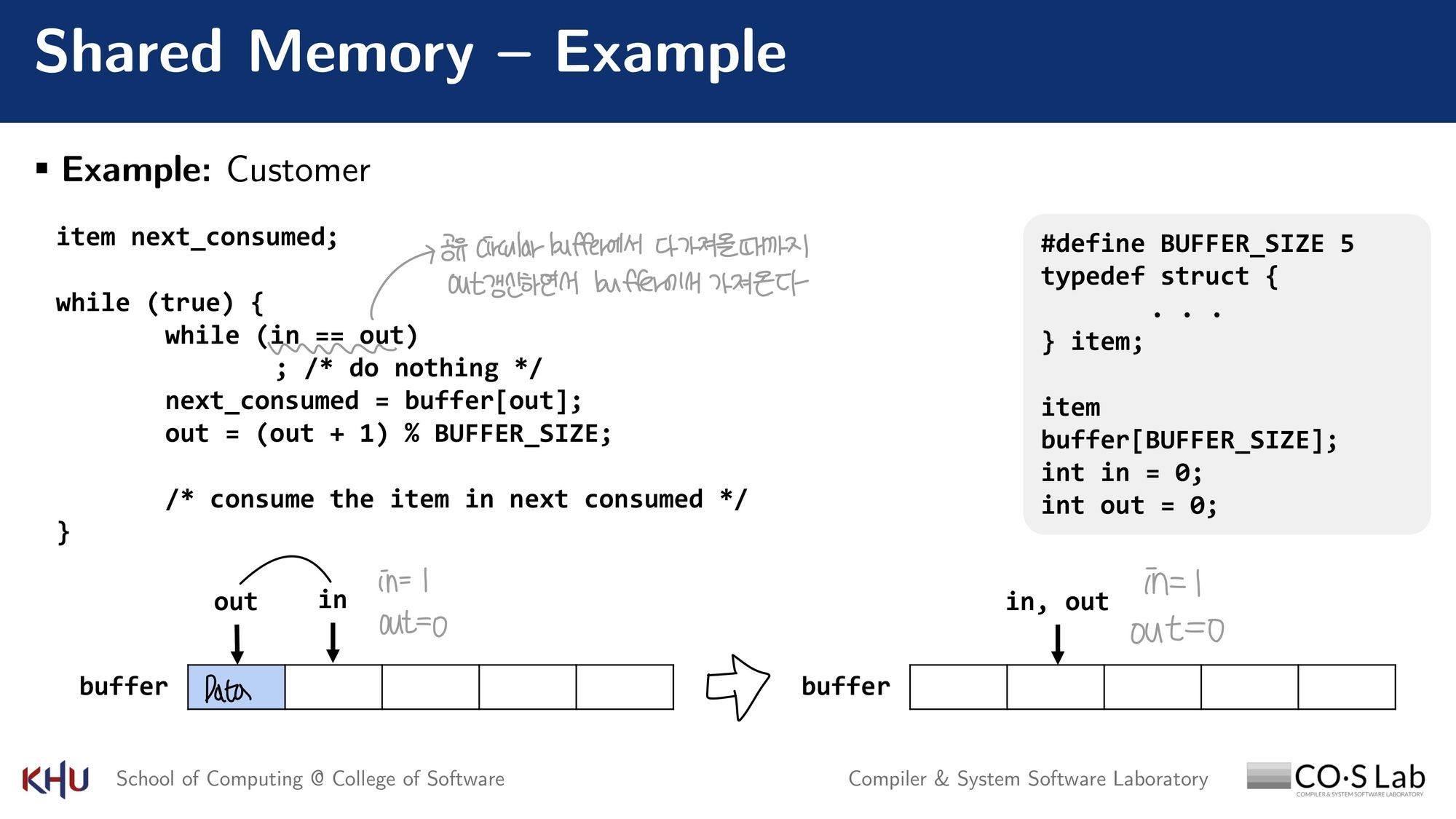 - shared memory๋ ์๋ก ๋ฉ๋ชจ๋ฆฌ๋ฅผ ์ด๋์ ์ธ ์ค ์์์ง๋ง, ์ด๊ฑฐ๋ ๊ณต์ ๋ณ์์ ์์งํ์ง ์๋๋ค