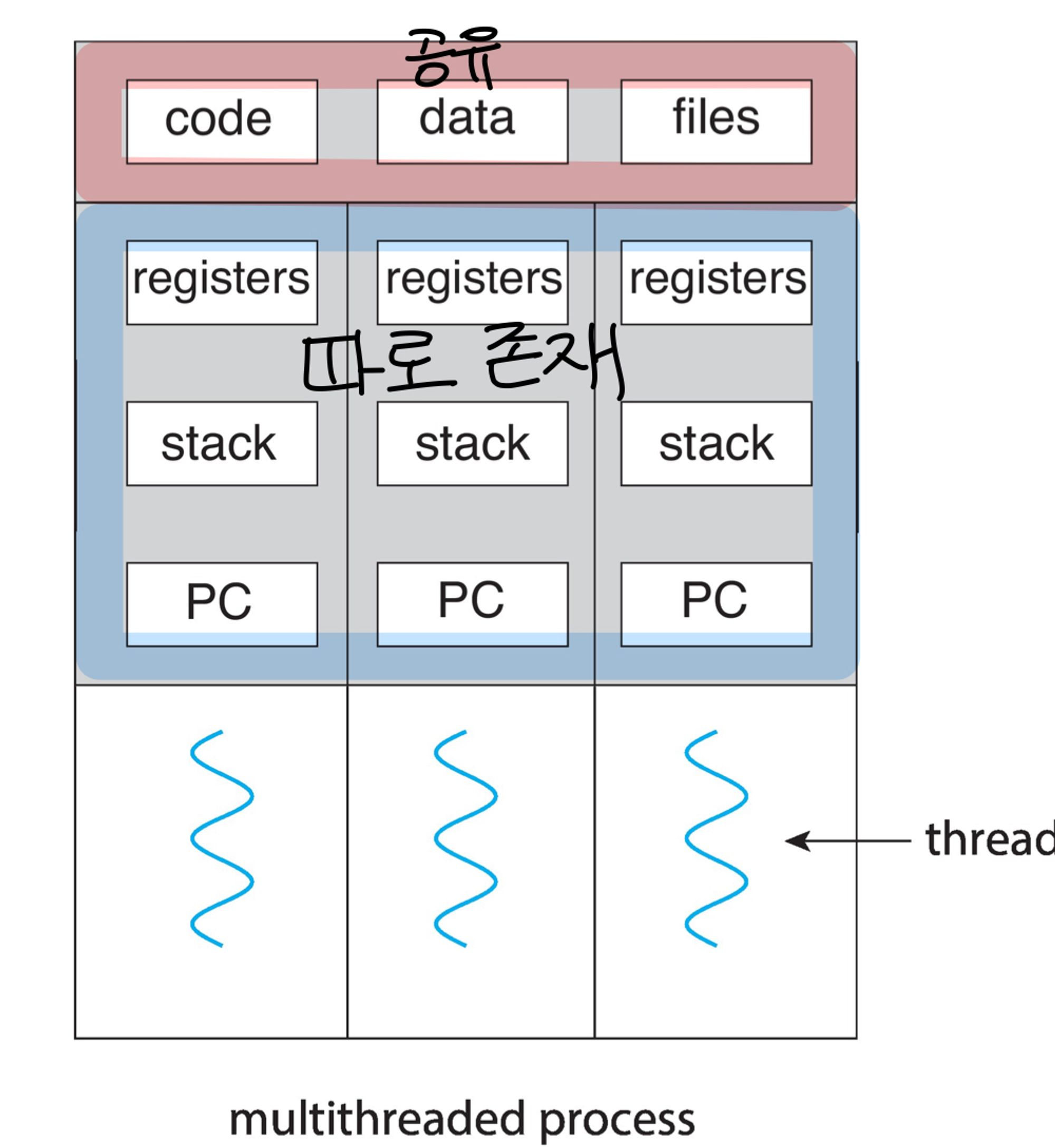 - Thread : CPU๋ฅผ ์ฌ์ฉํ๋ ๊ธฐ๋ณธ์ ์ธ ๋จ์ (Basic Unit of CPU utilization)