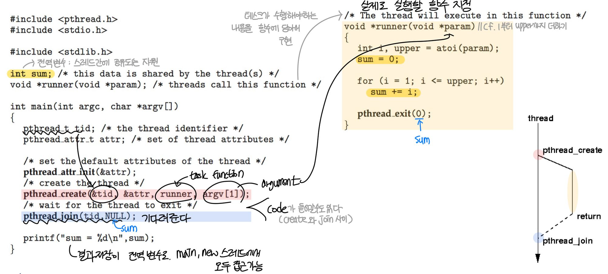 - sum์ ์ ์ญ๋ณ์๋ก ์ฌ์ฉํ์ง ์์ ๋ ๋ฐฉ๋ฒ(์ ๊ทธ๋ฆผ์์ ํ๋์ ๊ธ์จ) : task function์ defineํ ๋ pthread.exit()์ ํ๋ผ๋ฏธํฐ๋ก ๋ณ์(sum)๋ฅผ ๋ฃ์ด์ฃผ๊ณ , pthread_join()์ ๋ ๋ฒ์งธ ํ๋ผ๋ฏธํฐ์(๊ทธ๋ฆผ์์๋ NULL๋ก ์ง์ ๋์ด์์) ๊ฐ์ ๋ณ์(sum)๋ฅผ ๋ฃ์ด์ฃผ๋ฉด ์ค๋ ๋์์ ์์ ํ ๋ด์ฉ์ด ๋ฐ์๋์ด ์ ์ฅ๋๋ค.