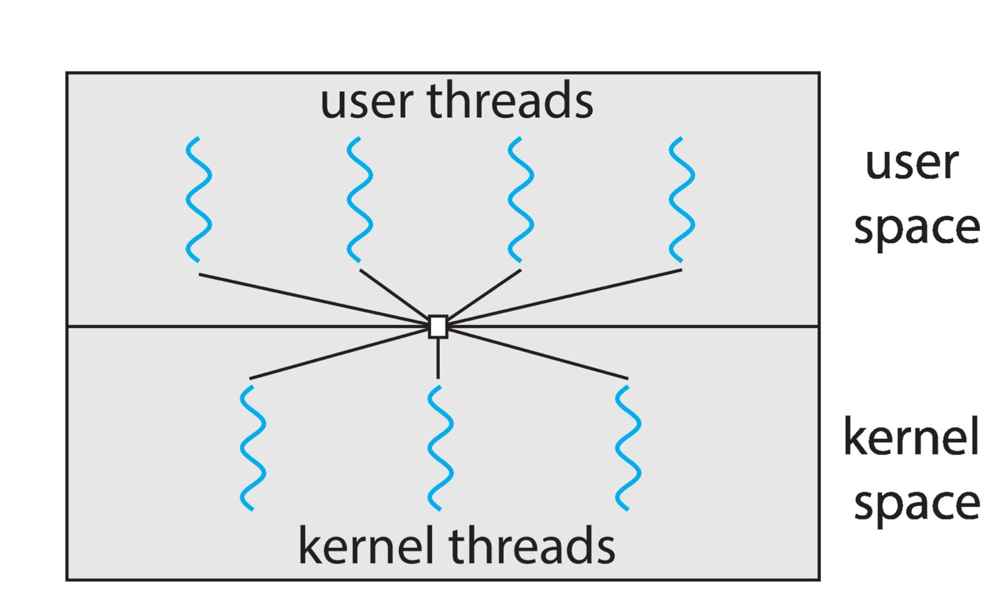 - user thread ์ฌ๋ฌ๊ฐ ↔ kernel thread 1๊ฐ