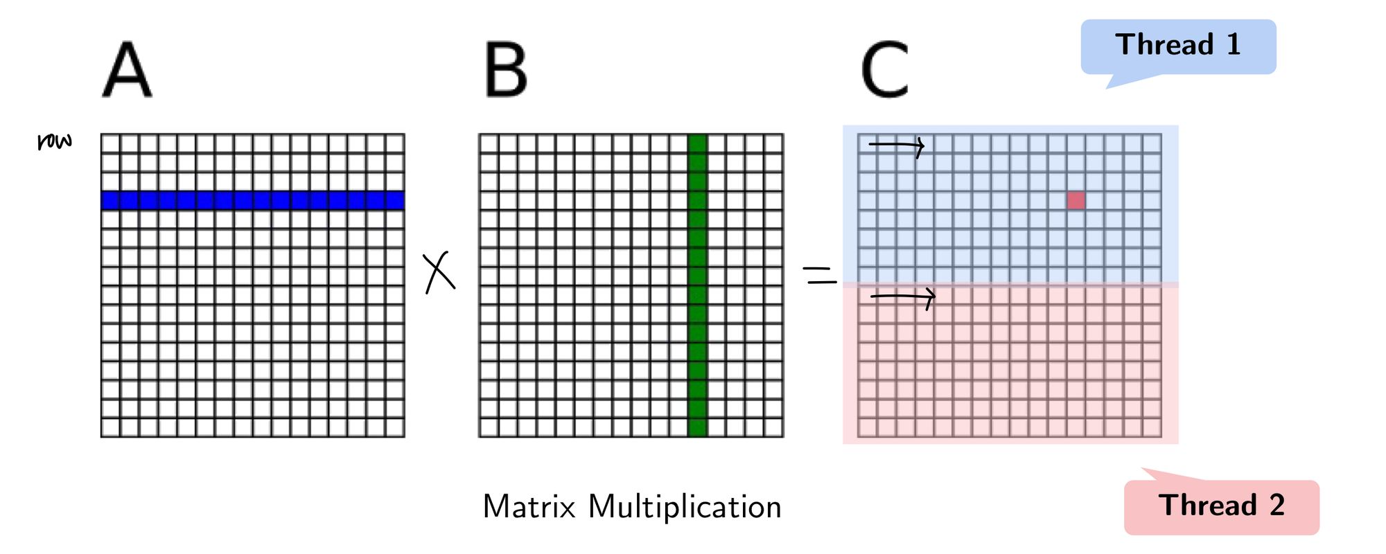 : Matrix Multiplication(ํ๋ ฌ๊ณฑ)์ ํ ๋ ํ๋์ ์ด๊ณผ ํ์ ๊ณฑํด์ ๋์์ parallel ํ๊ฒ ๋ณ๋ ฌ์ฒ๋ฆฌํ๋ค.