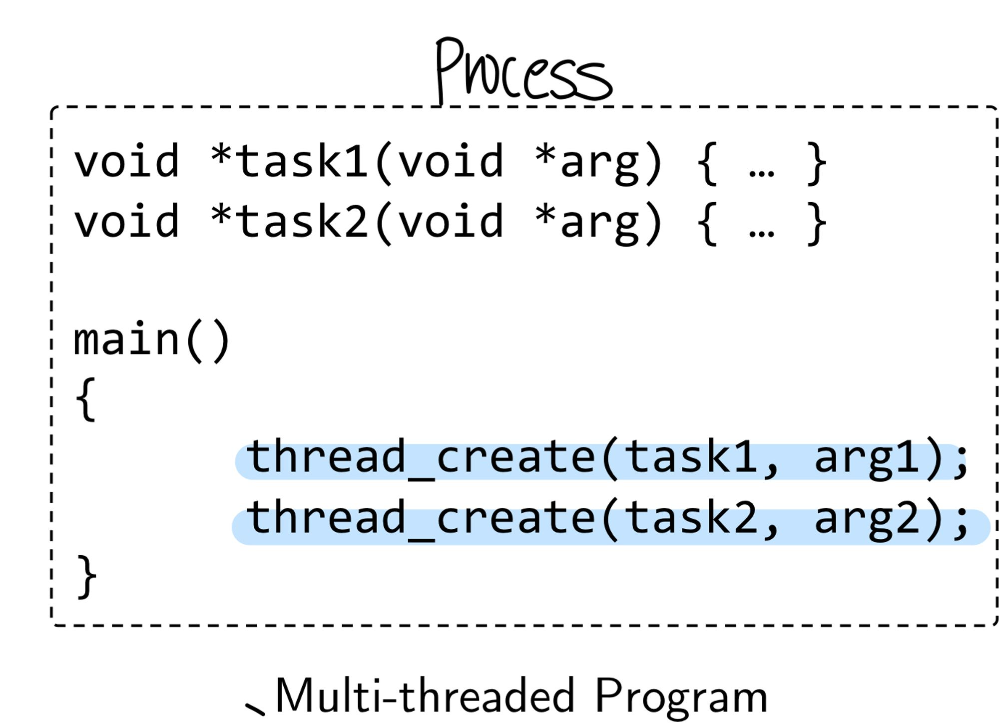 : ์ฝ๋ ์์ฒด๋ ๊ฐ์ ๊ณต๊ฐ์ ์์ง๋ง(= ๊ฐ์ ํ๋ก์ธ์ค์ ์์ง๋ง), ๋ค๋ฅธ ์ค๋ ๋์์ ์คํ → task1()๊ณผ task2()๊ฐ ๋์์ ๊ฐ ์ค๋ ๋์์ ์์