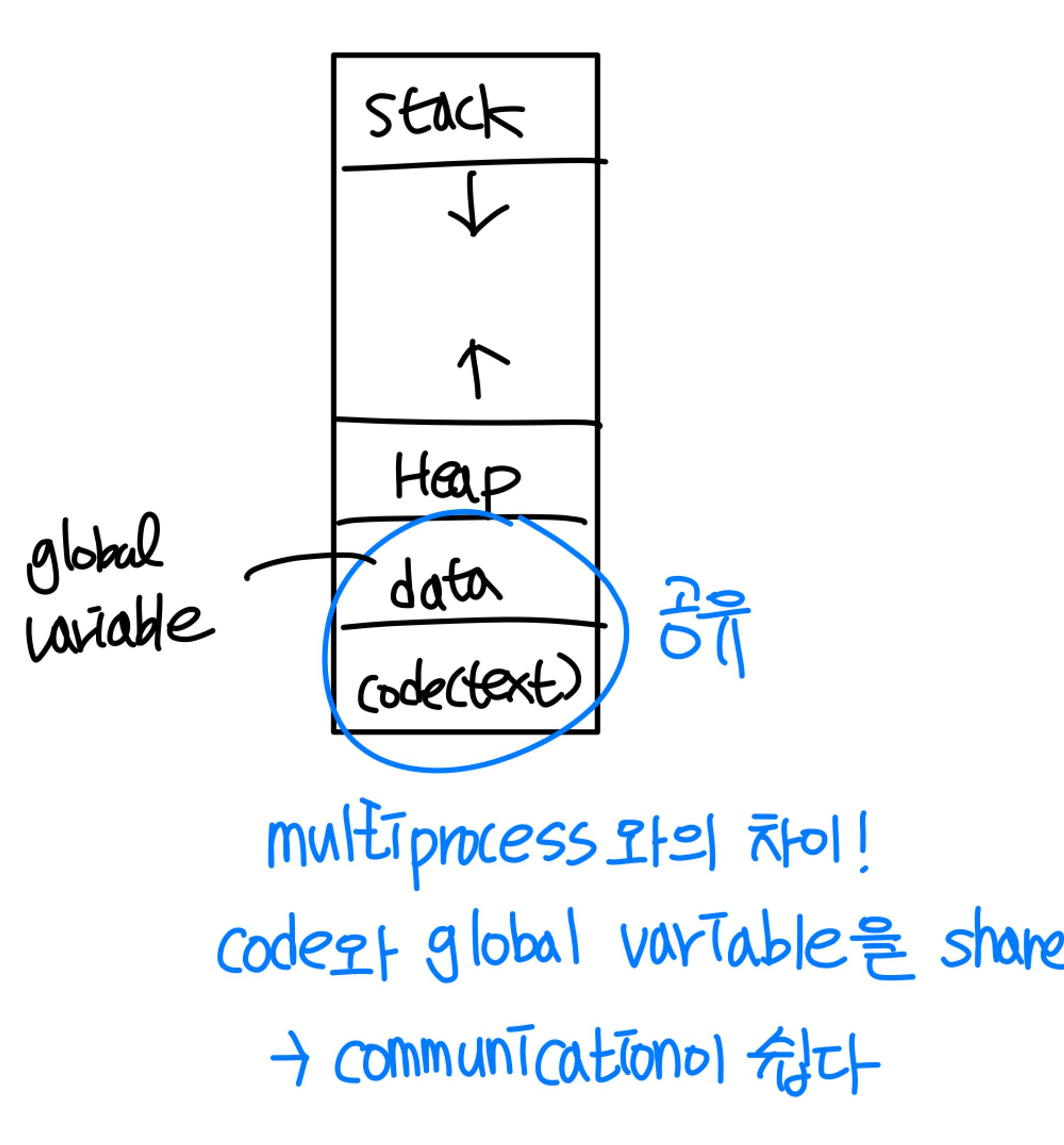 ๋ฉํฐ ์ค๋ ๋์ผ ๋๋ฅผ ๋ณด๋ฉด ์ค๋ ๋๋ง๋ค stack์ ๊ฐ๊ฐ ๊ฐ์ง๊ณ ๊ทธ ์์์ ๊ฐ ํจ์ ๋ถ๋ถ์ด ์ ์ฅ๋์ง๋ง, ์ ์ญ ๋ณ์ ๋ถ๋ถ(data)์ ๊ณต์ ํ๋ค!